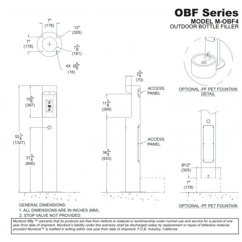 Model M-OBF4 Bottle filler shall be activated by a 9 volt sensor or the push-button as standard. Unit shall contain a 100 mesh inlet strainer, lead and cyst filter, 6-AA battery pack and laminar flow spout.