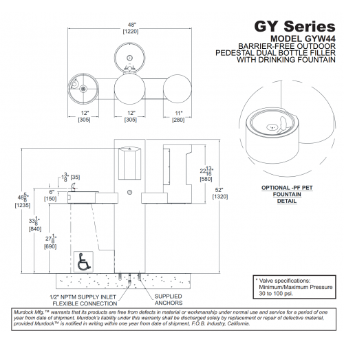 GYW44 Series is an Outdoor Pedestal Bottle Filler. The unit has dual barrier-free arms featuring an additional bottle filler and drinking fountain. Bottle fillers shall be activated by a 9 volt sensor or a pushbutton as standard. Unit shall contain a 100 mesh inlet strainer, lead and cyst filter, 6-AA battery pack and laminar flow spout.