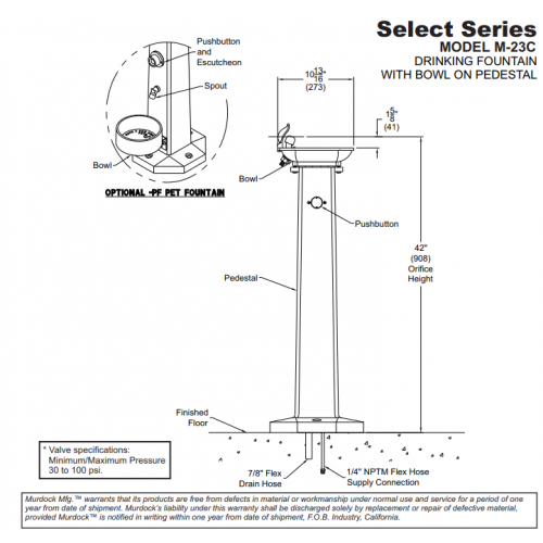 Model M-23C drinking fountain features design simplicity. This single fountain unit includes a pedestal mounted bowl and bubbler operated by push-button control.